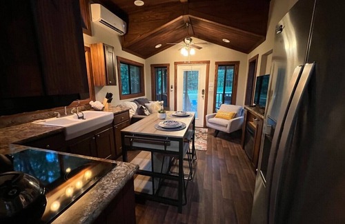 This secluded tiny house blends nature and fun design into a seamless indoor/outdoor flow. Plenty of space and natural light give Snuggle Up the unusual feeling of a larger space compared to most tiny houses. While the outdoors takes center stage, the interiors contribute a cozy lodge vibe that is simply superb. You might never want to leave! Come experience the vacation you've always imagined at Snuggle Up!