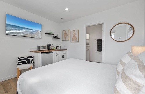Nestled in the vibrant South O neighborhood of Oceanside, CA, our newly remodeled South O Bungalows offer a stylish coastal retreat designed for relaxation and convenience. This upscale boutique hideaway features a Queen bed, sleek contemporary furnishings, a well-equipped kitchenette with a small fridge, microwave, toaster oven/air fryer combo, and Keurig coffee maker—perfect for effortless meals and morning coffee before a day exploring the coast.