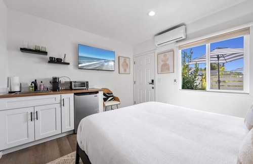 Nestled in the vibrant South O neighborhood of Oceanside, CA, our newly remodeled South O Bungalows offer a stylish coastal retreat designed for relaxation and convenience. This upscale boutique hideaway features a Queen bed, sleek contemporary furnishings, a well-equipped kitchenette with a small fridge, microwave, toaster oven/air fryer combo, and Keurig coffee maker—perfect for effortless meals and morning coffee before a day exploring the coast.