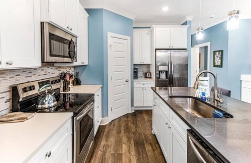 This home is centered around convenience - you can park your vehicles around back, and head right into your new home away from home! You'll find the home is furnished with tasteful decor, and rich, warm furnishings throughout. Each space has been carefully thought out to create a comfortable environment, whether you are here for work or leisure, with friends and family, or traveling alone! The open floor plan is great for entertaining, and you'll never feel separated from the rest of your party. The gathering space, at the front of the home, features a large smart television, and an ample amount of seating for everyone to gather that opens up to the formal dining space. You can find six seats available at the dining room table to enjoy home cooked meals together or gather around for a game of cards. The kitchen features beautiful grey quartz countertops, plenty of storage, stainless steel appliances, and fully stocked with everything you need.