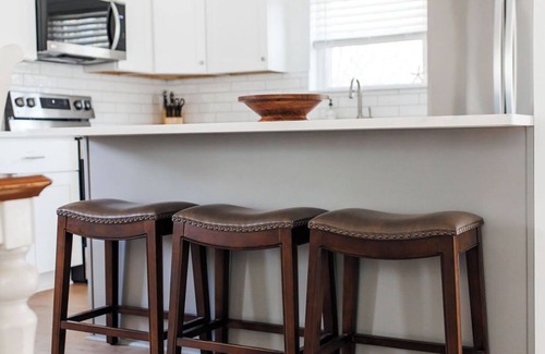 Here on the second floor main level, you also have access to two separate eating areas, a large table that seats eight comfortably and a smaller table just off the kitchen if you prefer a table for four. The kitchen is a chef's delight, fully-stocked with everything from a Keurig and coffee pot to ample cookware for preparing delicious meals. This main floor offers two outdoor decks to enjoy a cup of coffee or a meal at the outdoor table for four. With hardwood floors, high ceilings, new appliances, family-friendly amenities and a dedicated work space for your needs, this second floor is where the details shine.