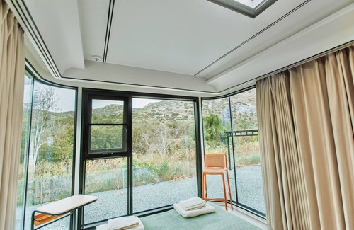 The capsule features a cozy double bed with premium linens, a sofa bed, air conditioning, and heating for comfort in any season. A panoramic window and a roof window let you enjoy breathtaking mountain views and the starry sky.