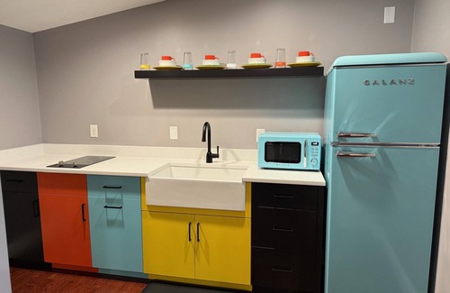 Kitchenette has a two burner cooktop, Keurig, microwave and refrigerator. There is also a slow cooker and toaster oven. Stocked with Fiestaware place settings for (4), measuring cups & spoons and mixing bowls.
