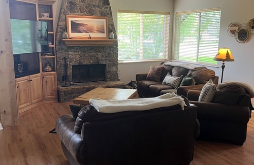 The open floor plan is ideal for families and friends to spend time together, making memories to last a lifetime. The full kitchen has every thing you need for making hearty meals to satisfy your crew for adventurous days, and for just hanging out together. The dining table seats 6 and the breakfast bar seats 3, and there’s plenty of room on the overstuffed furniture for everyone to relax around the warm fire and share stories or watch a movie on the large TV.