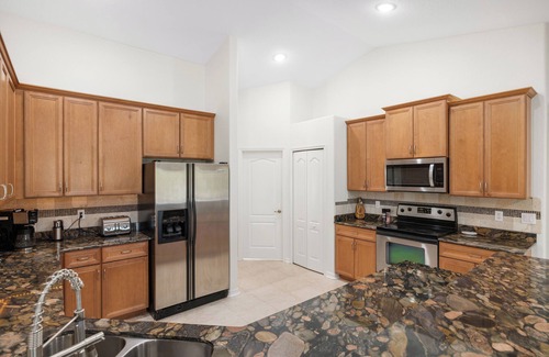 Step outside to discover your private outdoor oasis. The screened-in lanai is the ideal spot to savor your morning coffee while taking in the tranquil views of the lush backyard. The lanai is furnished with comfortable seating and a dining area for al fresco meals. Fire up the grill for a barbecue or take a refreshing dip in the sparkling heated pool to beat the Florida heat.