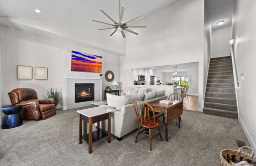 As evening falls, enjoy our smokeless fire pit or fire up the grill and enjoy a delicious BBQ while taking in the stunning sunset views over the lake. Inside, our home is designed for both relaxation and entertainment, featuring a cozy living area with a fireplace and indoor games that will keep everyone entertained during those cooler Michigan evenings.