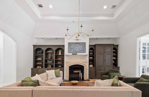 Stretch out in the stylish main living space with a large sectional, fireplace, smart TV, and elegant built-ins—perfect for relaxing or catching up.
