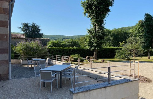Access to a shaded picnic area on the banks of the Aveyron River is available.
