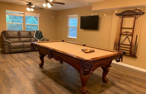Stay comfortably in Shaver Lake at this 4-bedroom cabin. This serene retreat offers 2 king beds, 1 queen bed, and 1 bunk bed for a phenomenal stay. With 4 bathrooms including a jetted bathtub, guests can relax and unwind after a day of exploring. The cozy loft with a full bed and twin bed provides extra space for sleeping. The loft is also equipped with a foosball table. There is also a large pool room and bar area with lots of seating. You can also enjoy 3 separate decks for relaxing. On the main deck there is a screened in porch eating area with picnic table and grill. You're sure to make fantastic memories with a stay at our place.