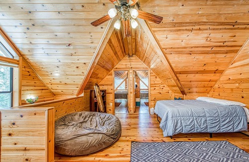 With a cozy, lodge-style atmosphere, complete with wood plank floors, walls and ceilings, as well as a warming wood-burning fireplace, this home offers a peaceful interlude to daily life. The living area is roomy with a large sectional sofa, TV, and VHS/DVD players. In addition to the large, fully equipped kitchen, there's a charcoal grill on the deck, which features a table and chairs for dining in the great outdoors. And if kids are part of your crew, you'll all love the loft area and collection of toys, books, and games.