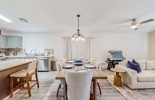 Upon pulling up the drive, you'll immediately be struck by the home's immaculate curb appeal. The real magic, however, unfolds as you step through the front door. As you enter, you'll be greeted by an open interior, comfortable furnishings, and an overall modern design. The main living area boasts an inviting atmosphere, with ample room for relaxation and socializing. Cozy up on the plush sofa and stream your favorite show, engage in some playful competition over the vintage arcade system, or gather around the fireplace for a night of storytelling and laughter. The heart of the home lies in the gourmet kitchen, equipped with everything you need to prepare delicious meals.