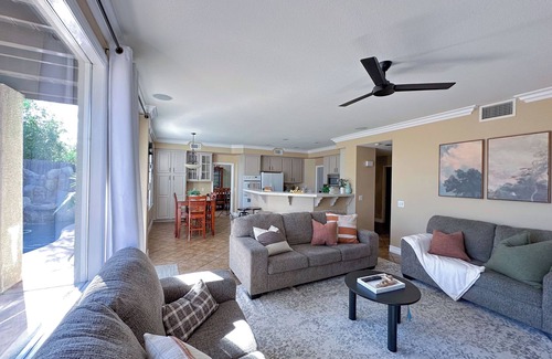 Welcome to your perfect getaway! This spacious 4-bedroom, 3-bath home accommodates up to 10 guests, making it ideal for families and friends. Enjoy the comfort of 5 cozy beds, including a master suite with an en-suite bath. Relax by the private pool, perfect for sunny days and fun gatherings. The open living area is great for socializing, while the fully equipped kitchen makes meal prep a breeze. Located in a friendly neighborhood, you'll be close to local attractions and dining.