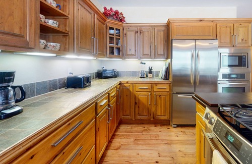 This three-story home has enough space to host large families, groups of friends, and couples alike. Entertainment will be endless with the well-appointed game room in the basement, which has a wet bar, a comfortable seating area, a large flatscreen TV, and a full-size pool table. The basement also hosts two bedrooms with their own en suite bathrooms with tub/shower combos. Climb up the stairs to reach the second level of the home, where the main living space is located. Here, you will have plenty of comfortable areas to unwind and even access to a private patio with views of Aspen trees. The gas grill is just perfect for family barbecues and the shared hot tub will be just the place to soak under the stars. The chef of the group will have a blast in the open and fully-equipped kitchen. This space has been beautifully appointed with stainless steel appliances, including a French-door fridge, stove, dishwasher, stove, microwave, electric oven, and two coffee makers. The gorgeous island has seating for two, so the chef is not left alone while treating you all to delicious meals, which will take place at the gorgeous dining room with an eight-person dining table. This level also features a private office ideal for remote working while on vacation, along with a primary bedroom with a flatscreen TV and an en suite bath with a separate tub and a standalone shower. Three more bedrooms with three en suite bathrooms are located on the third level.