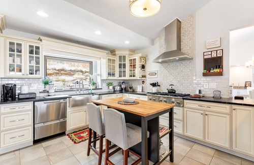 Inside, you’ll find an open floor plan, vaulted ceilings, and lots of natural light. The chef will adore the fully-equipped, updated kitchen, with a full suite of stainless steel appliances, including a double-door refrigerator, double oven, six-burner gas range, and double-drawer dishwasher, perfect for smaller loads. At the end of the day, three comfortable living spaces, each with a TV and plenty of seating, offer lots of entertainment options. Grab a spot on the giant sectional upstairs for a movie night, while the rest of the gang plays cards or dunks baskets with the fun basketball game downstairs. With in-home WiFi, a DVD and Blu-Ray player, and five TVs, there’s something for everyone. When it’s time to turn in, three bedrooms upstairs and two downstairs await.