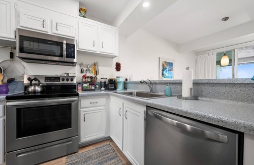 Fully equipped kitchen with stainless steel appliances, refrigerator, dishwasher, electric oven, microwave, coffee maker, Keurig coffee maker, French press, toaster oven, InstantPot, air fryer, Nutribullet, and more. Full array of spices and cooking oils, wraps and foil. Starter coffee and Keurig cups.