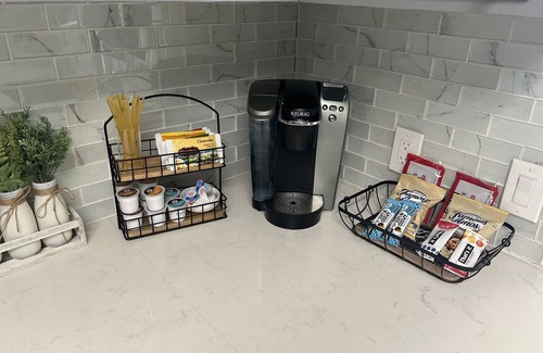 Kitchen boast all new appliances and quartz countertops. Kitchen is equipped with cooking essentials, pots, pans, cooking utensils, plates, cups, bowls. Kitchen also has a Keurig machine for your convenience.