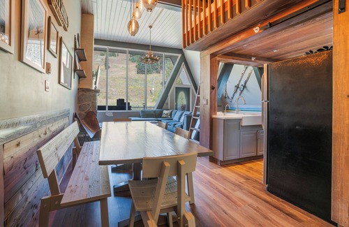This charming mountain retreat offers spectacular views of the slopes from the bright and spacious living area, complete with a stone gas fireplace and a fully equipped kitchen. The open-concept layout is perfect for gathering after a day on the slopes. The master queen bedroom includes a private ensuite, while a second queen bedroom offers additional comfort. The unique layout also features two lofts—one with four twin beds, perfect for accommodating extra guests, and one recently converted into a fun children's play area. A full bathroom and convenient stacking washer and dryer complete the interior amenities. Step out onto the private deck, where you can relax in the hot tub, fire up the BBQ, and store your gear in the ski locker at the bottom of the stairs. With room for up to 9 guests, this property is perfect for families or small groups. The hot tub is filled and included in the nightly rate during the summer season, making this home ideal year-round.