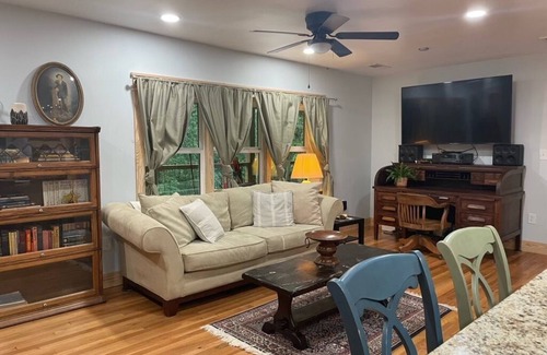 Very unique home just miles from Athens. Once a local general store, this space has been transformed into a beautiful 3 bedroom, 3 bathroom home with modern amenities. The space has been skillfully renovated and finished for a comfortable and spacious stay. It has a large open space common area, great for family gatherings, cooking or watching the game...