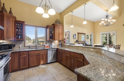 This ultra-spacious home has an abundance of natural light with cathedral ceilings and windows offering awe-inspiring views of the surrounding canyon. Secluded in a private mountain setting, conveniently nestled on the edge of town, this residence offers the best of both worlds—tranquility and accessibility.