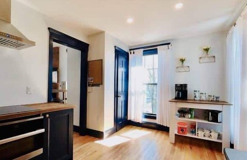 This spacious, two-level unit features rich navy accents, original brick walls, skylights, and wood-beamed ceilings that highlight its historic charm. Spanning the left side of the second floor and the entire third floor, it offers plenty of space for groups or families. Central AC throughout provides comfortable temps throughout.