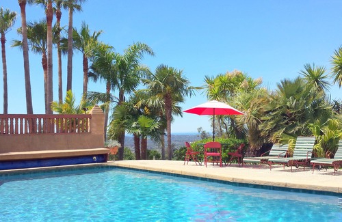This is a peaceful Spanish Mission style retreat on a spectacular site with a large, private pool in the foothills of Santa Barbara. It has magnificent views, wonderful sunsets, and a tropical landscape that lends an exotic resort feeling.