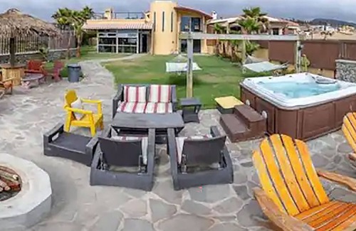 You fall asleep to the waves breaking on the beach after you watch the glorious sunset through the floor to ceiling windows. You can watch the surfers and dolphins from the oceanfront jacuzzi and roast marshmallows over one of the fire pits. The house has .9 Bedrooms and sleeps up to 24 people. You walk from our Premier 8000 square foot oceanfront estate and walk down five steps onto the beach. You can sip wine on the oceanfront as you watch the spectacular sunsets. Enjoy a meal catered by the best chefs from nearby restaurants using locally sourced organic produce, meat and fish. Take a wine tasting tour of the Guadalupe Valley in a luxury van or go horseback riding on the beach or in the hills overlooking the ocean. You can take our kayak out to the kelp beds to fish, you can play tennis on the community tennis courts or you can walk around our development and enjoy the security and calm of a gated guarded ocean front complex. Our house is huge and is perfect for large groups. We are located 10 minutes south of Rosarito next to Puerto Nuevo and near excellent restaurants including La Fonda, Splash and Encanto. We can help you arrange activities for your group or you can relax and soak up the sun and then when you’re ready to go home we’ll give you a fast pass and you can avoid the border wait. Our renters tell us that it’s the best rental experience they’ve ever had. Book your spectacular stay today.
