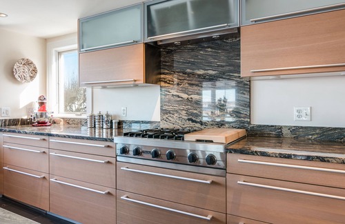 This fully renovated residence is located on a beautiful expanse of oceanfront land (3/4 of an acre) at Gap Cove in the desirable South End of Rockport. This air-conditioned property has 5 bedrooms (sleeps 12), 4.5 bathrooms and an open plan ground floor with panoramic ocean views extending from the kitchen on one end to the second sitting room on the other side of the house. There is a large dining room containing a custom-built brushed aluminum dining table that seats 12. The dining area transitions into the living room, which is equipped with a wood-burning fireplace and offers comfortable seating in the form of ample sofas, chairs and cushioned banquettes that line the windows. Glass patio doors lead out into the yard, which is separated from the ocean by an exquisite, almost sculptural, golden rockscape. The ground level has a second sitting room, also with panoramic ocean views, that is accessed through a glass corridor. This sitting room has a modular sofa, plenty of reading material and a widescreen TV. The beautiful cedar ceiling rises to give an expansive view of Sandy Bay and its pink and orange sunsets. This second sitting room also features a large porch that overlooks the garden and the ocean below. The ground floor is equipped with a half bath, a laundry room with two washers and one dryer and a mud room. The kitchen is a showstopper: a thoughtfully configured chef’s kitchen with sleek fronts (from the German designer Poggenpohl), extensive Dakota mahogany granite countertops and the extraordinary ocean scene right outside its many windows. The kitchen includes a central island, a large side by side refrigerator, dishwasher, double sink (with garbage disposal), bread drawer, steam oven, regular wall oven, six burner gas stove-top, pantry, high breakfast table with a red lava stone top and seven stools. There is a separate bar area with two Sub Zero undercounter drink drawer fridges and a massive Sub Zero wine refrigerator. Everything you need in exactly the right place to make culinary creativity flourish.