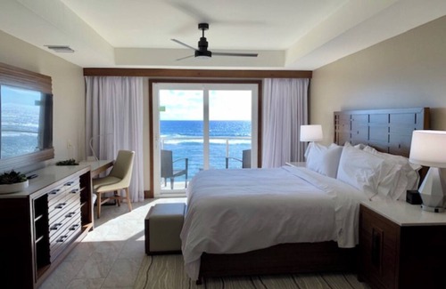 This unit is like Brand New. Recently refurbished. The 3BR 2Bath unit sleeps up to 8. Master BR has a King with on suite private bath and spectacular ocean views with a private balcony. The other 2 BR's have King Beds. There is a pull out couch that sleeps up to 2 more. It comes with a fully equipped modern kitchen. Flat screen TV's and Internet. The family room also has a Ocean Front balcony. The pool is amazing. It has a Beach Bar and restaurant. And snorkeling is right off the beach. This unit is rented only Saturday to Saturday for 7 nights or 14 nights.