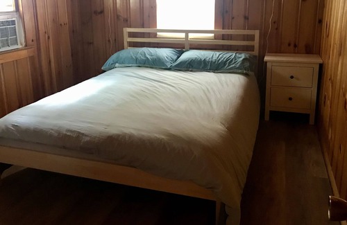 The updated bathroom is bright and clean. It’s a great spot to wash off the day’s adventures. It has a shower/ tub combo, vanity/sink, medicine cabinet, open shelving for stacking things like towels and multiple hook options for hanging things like toiletry bags and wet bathing suits.