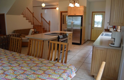 This two story house has two bedrooms and can sleep 6-8 guests. One bedroom has a queen bed, the other bedroom has two twin beds, and there are two twin beds on the upstairs landing (rollaway beds). There is also a fold out futon couch in the downstairs living room and a child size cot that is stored in the closet when not used. The downstairs living area is a great room with an open concept perfect for entertaining and large groups. In addition, the Lake House includes a private picnic table, lawn furniture, and grill.