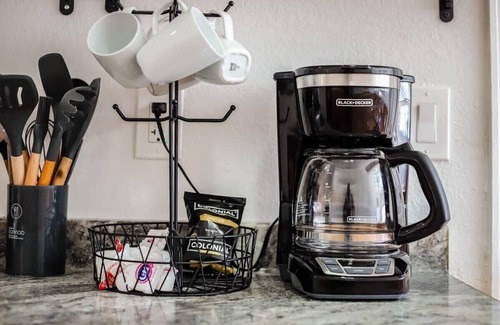 If you need to make a meal or just get a snack, walk from the main area to the kitchen where you will find a refrigerator, gas stove/oven, toaster, microwave, coffee and all the cookware and dishes you need! Enjoy a kitchen dining table set for four in our cozy nook with lots of sunlight. If you prefer to grill you can open up the back door to your own private fenced in patio for grilling or just sit and enjoy the fresh mountain air and enjoy the night sky!