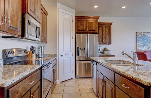Gorgeous Getaway is located in the exclusive golf community of Coral Ridge Resort and is perfect for your next Southern Utah getaway. Featuring four bedrooms and two and a half bathrooms, this condo easily sleeps 10 adults, with a king in the main floor master, king in the second, and queens in the third and fourth bedrooms. The leather sofa sleeper includes a queen memory foam mattress, while each of the bedrooms boasts a plush Serta cool gel memory foam pillowtop mattress for your most comfortable nights away from home. All bedrooms and the main living area have ceiling fans for extra cooling features. The kitchen is fully stocked to meet your cooking needs and includes granite countertops and stainless steel appliances, a toaster, blender, hand mixer, and coffee maker, and more. This condo includes cable on all three large flat screen smart TV’s, capable of connecting to your personal accounts such as Netflix, Hulu, etc. Each TV is accessorized with blue ray players and 50+ mgs of high speed wireless internet.