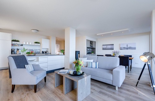 Luxury apartment with a clear view of the Baltic Sea right on the water, two terraces, Finnish sauna and fireplace for a maritime holiday of the extra class. Luxury apartment "StarBoard" - let your mind wander and let your gaze wander over the water - that is pure vacation!