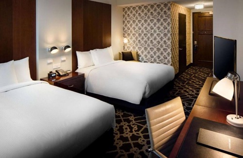 This room comes with a 40-inch TV, a Hilton alarm clock radio with MP3 connection, a chair, an ottoman, a work desk, phones with voicemail, a safe, coffee maker, mini-bar, iron with ironing board and a hair dryer. The floor-to-ceiling marble bathroom is equipped with a tub.