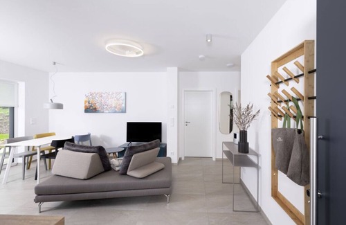 BLEIBE4.1 | Antraciet ontmoet hout: Exclusief 5* vakantieappartement in het hart van het Fichtelgebergte. Modern badkamer, 2 slaapkamers, WLAN, parkeerplaats met elektrische laadpaal.