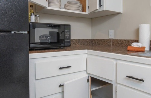 Full kitchen is stocked and ready for preparing meals from home. Refrigerator, stove & oven, apartment sized dishwasher, microwave, coffee maker, and some small appliances. All utensils & cookware are included to make eating in, convenient and enjoyable. Enjoy breakfast, lunch, or dinner seated at the dining table! Dining table can pull out to accommodate up to (4).