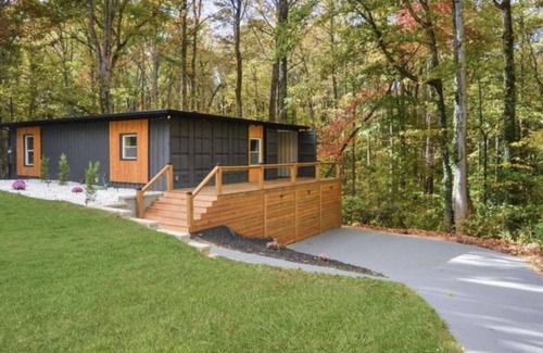 Welcome to the tranquil oasis of the Woodstock Steel House, a distinctive retreat nestled just a stone’s throw from the vibrant heart of Downtown Woodstock and the bustling scene of Atlanta. Crafted with innovative flair, our property redefines contemporary living through the ingenious transformation of 4 shipping containers into a serene 2-bedroom, 2-bath sanctuary, set amidst an enchanting woodland acre.