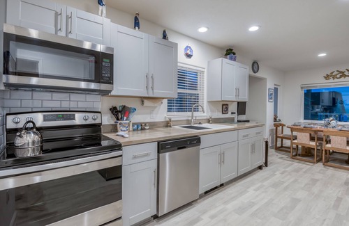This adorable, blue-shingled ocean-view home is right across the street from the beach in central Lincoln City—and it's as charming indoors as out. Thoughtful updates and a pet-friendly vibe, soothing Coastal decor, new flooring and updated kitchen will charm and relax you instantly. You'll find sweet little extras like a pet station near the front door and a coffee bar in the kitchen. The main-floor queen bedroom is right across the hall from a beautifully updated bath.
