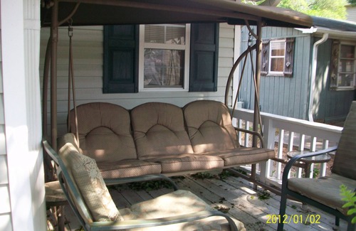OUTSIDE at the deck is a grill, table, chairs, and a swing for your comfort.
