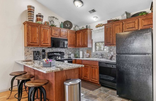 The living room is the perfect place to gather at this property. It is filled with natural light and is the perfect place for everyone to gather together. The area is very cozy, yet has plenty of room for the whole family to spread out and relax after a long day. We've included everything you need for you to enjoy on your vacation. The living area is open to the kitchen, so you're never far from a quick snack! The kitchen comes with everything you need to make your favorite meal for your family. Why wait in long lines when you can enjoy your favorite recipes right in your home-away-from-home? We have it all. There is also a dining area - seating for everyone! Walk out from the living room to the large deck with wooded views. The unit also includes a washer and dryer.