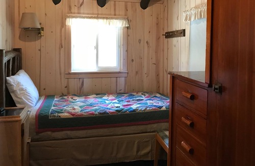 MASTER BEDROOM: Pocket door, DOUBLE/FULL bed with rustic headboard, dresser, and nautical mirror. Tall people (~6') be careful of your heads; the ceiling in here is low. Please note this is a double bed, not a queen size. Due to cozy quarters, the bed sits against the wall.