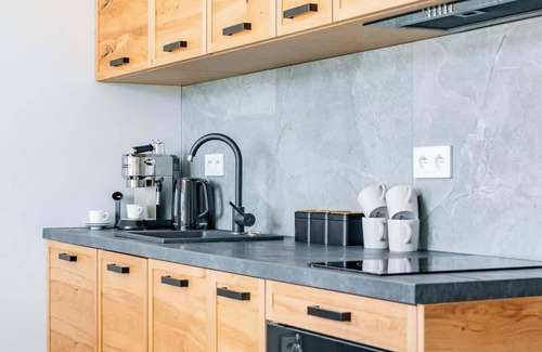 Relax in a comfortable apartment in a green mountain enclave with a view of Giewont, located right next to the Tatra National Park. We offer our guests a space that combines the Podhale tradition with modernity. Here, you will find an outdoor relaxation area, a children's playground, and water ponds that create a charming atmosphere.