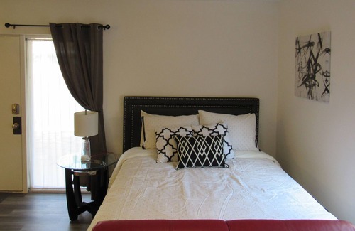 Enjoy a luxurious stay in our sleek designer studio. This unit is freshly renovated and remodeled with brand new furnishing, appliances, and granite countertops. Sporting full kitchen, open floor plan, Queen-sized bed, Smart TV, free Wi-Fi, Keyless entry and all the amenities one needs to enjoy a comfortable stay. Single level corner suite with no units above. Within walking distance to grocery stores, food, laundry mat, post office and more. Come and enjoy your vacation in a stylish way. We look forward to hearing from you!