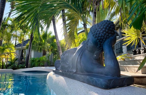 Access through the tropical garden to an outdoor terrace, table and 4 chairs