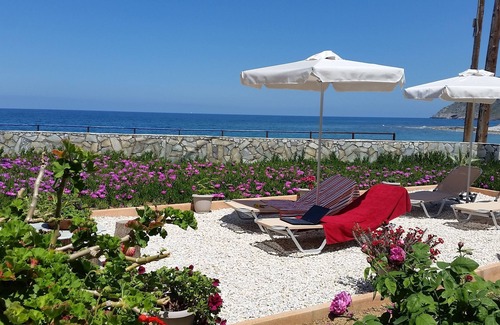The studio is located on Milatos beach, off the main square, on the main beach road and literally on the beach front! Enjoy our 400 m2 lush garden, with towering palm trees, fresh climbing vines, colourful flowers and two gazebos furnished with tables and chairs for our guests. There is also a space with umbrellas and sun lounges for sunbathing and relaxing.