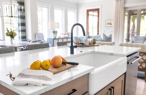 This lovely townhome offers the perfect backdrop for an idyllic vacation in Palmetto Bluff. NEWLY BUILT in SUMMER 2022, this home has both an unbeatable location in the heart of Moreland Village and breathtaking views of Lake Bales. With the sophisticated vibe of an “urban meets Lowcountry” southern-style townhouse, Lake Bales Sunrise House is three stories of light-filled interiors and an abundance of comfortable space to spread out. You'll appreciate the open floor plan of the main floor, with a living space appointed with comfortable furnishing, cozy fireplace, Smart, flat-screen TV and doors that open onto the charming outdoor balcony that overlooks Lake Bales. The main level accommodates large groups with ease, and the kitchen is fully equipped with everything you need for creating your favorite meals, and with seating for 3 at the large center island plus nearby dining room seating for 8 guests.