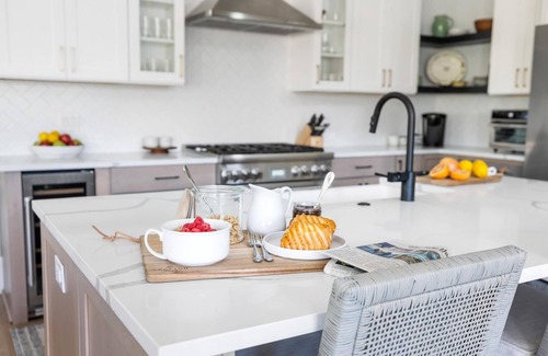 • Designer kitchen with high-end appliances, island seating for 3, and a dining table for 8