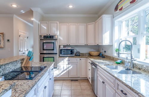 Upstairs are three bedrooms, including a secondary primary bedroom suite with a king bed and en-suite bath with tiled shower and jetted tub. Tucked into this room is a twin daybed. A great bedroom for a child to be near their parents. A second guest room has a queen bed. This bedroom shares the full hall bath with the 4th bedroom. In the fourth bedroom are two sets of twin bunks. A perfect kid's retreat! All the bedrooms have HD flat screen TVs.