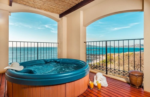 • Outside, you'll find a spacious pool, a hot tub, direct beach access, and oceanside loungers.