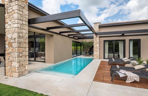 The luxury villa Silente is located in Istria, in the small stone town of Bale. This place bears the title of one of the most beautiful jewels of Istria and is located on the west coast of Istria. Istria is a well-known tourist destination for domestic and foreign guests who have decided to spend a wonderful vacation in peace and quiet while exploring historical sights and natural beauties. If you want to treat yourself and your family to an unforgettable vacation, now is the time! Villa Silente will delight you at first sight thanks to its wonderful contemporary architectural style. It was built in 2023 and offers a living area of 200 m2. The total area of the property is 874 m2. It is 7.7 km to the clean Adriatic Sea, which is not far as you are sure to arrive by car. You should definitely not miss a visit to the stone beach of Colone, where you will have as much fun as your heart desires in your favorite company. It has two beautifully furnished bedrooms with double beds (160 x 200). The villa also has two bathrooms with shower cubicles. The living room is really something special, it contains a sofa, a coffee table and a TV. There is also a romantic fireplace and right next to the living room there is a direct exit to the outdoor terrace with seating. You will certainly spend the morning hours there drinking coffee and reading your favorite book. A dining room with dining table and a modern and fully equipped kitchen are just part of the luxury that awaits you! The outdoor terrace offers the best: refreshment on hot summer days in a heated pool of 27 m² and 1.4 meters deep. There are 4 sun loungers on the lawn for you to rest and relax. You can use a barbecue, a washing machine and an iron. A high chair and a baby crib are available for children. Additional services offered by prior arrangement and for a fee are: Cook, babysitter, cleaner, gardener, transfer from the airport and private excursions. This historic stone town is situated on a hill and is surrounded by olive groves and vineyards. The picturesque Istrian medieval town is only 13 kilometers from Rovinj and 20 kilometers from Pula. These towns are also worth visiting and exploring. Taste the delicious gastronomic offer in the restaurants and enjoy like a king! Welcome to the beautiful Villa Silente!